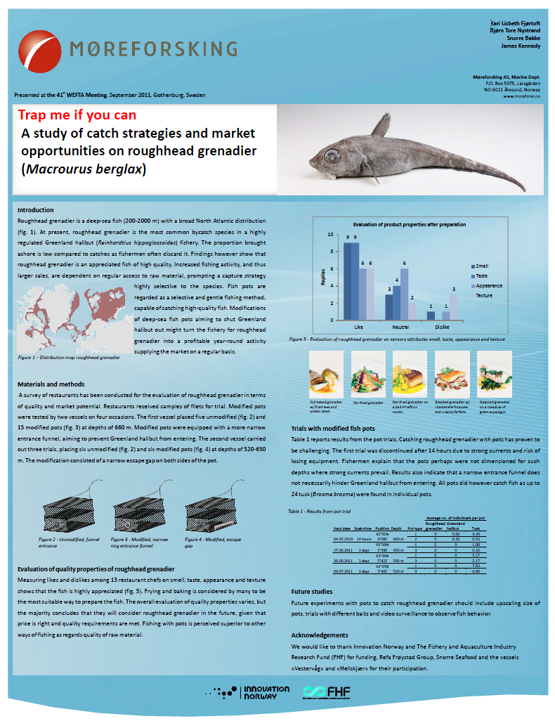 2011Trap me if you can - A study of catch strategies and market opportunities on ro...Trap me if you can - A study of catch strategies and market opportunities on roughhead grenadier (Macrourus berglax)Forfatter(e): Kari Lisbeth Fjørtoft, Bjørn Tore Nystrand, Snorre Bakke, James KennedyUtgiver: Møreforsking MarinOppdragsgiver: Innovasjon Norge, Fiskeri- og havbruksnæringens forskningsfondRapportnr: MASP 11-02Publikasjonstype: PosterNøkkelord: Macrourus berglax, Isgalt, Teine, Fish pot, Marked Last ned PDF Scientific poster presented at the 41st WEFTA Meeting, September 2011, Gothenburg, Sweden. Presenting a study of catch strategies and market opportunities on roughhead grenadier (Macrourus berglax).